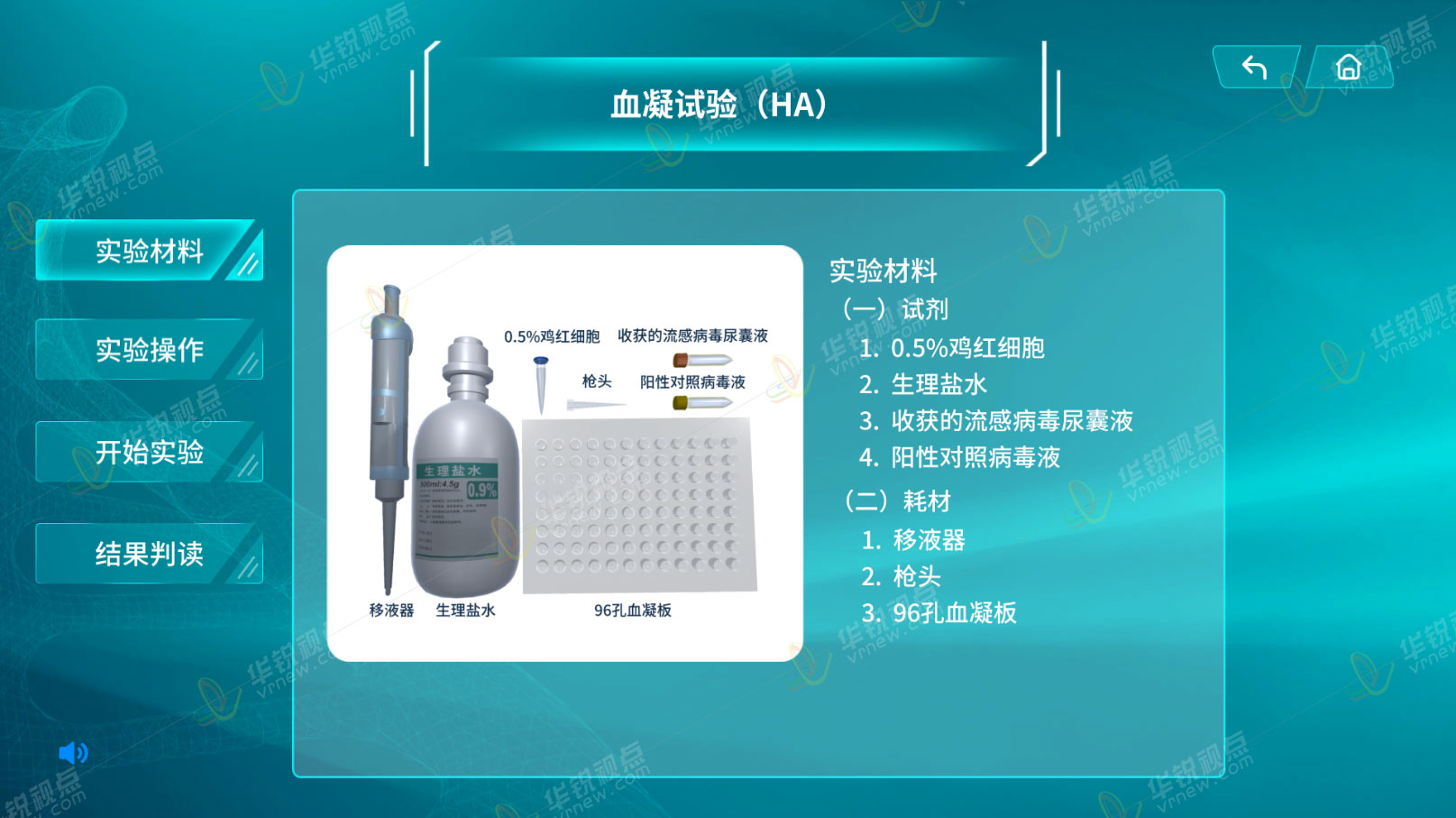 高致病性流感诊断VR虚拟仿真实验软件的内容主要包括:实验目的、基础知识、实验步骤提示、实验程序等。